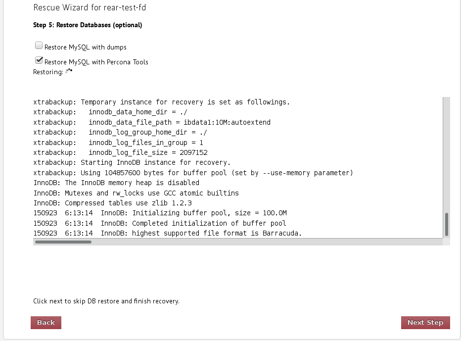 PLEASE NOT: Percona recovery only works with the default mysql data folder location as defined in /var/lib/mysql for other desired scenarios, you will need to restore mysql manually via regular recovery procedures.
