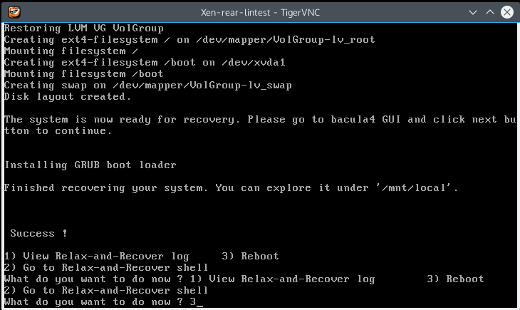 Within 15-30 seconds, boot loader is installed and server console prompts you to reboot server or check logs. Simply type "3" and press enter to boot the server.